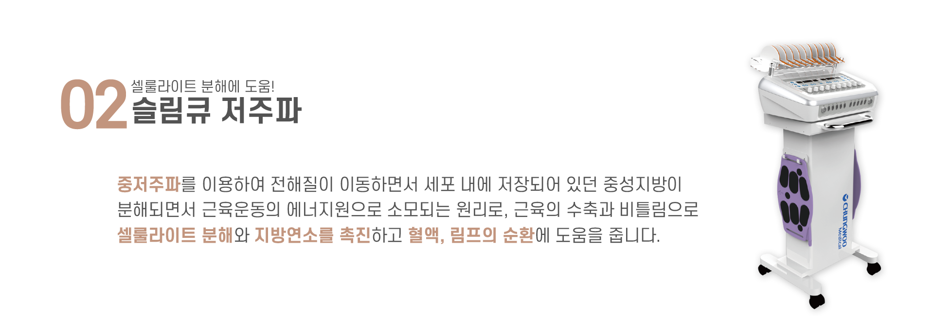 중저주파를 이용하여 전해질이 이동하면서 세포 내에 저장되어 있던 중성지방이 분해되면서 근육운동의 에너지원으로 소모되는 원리로, 근육의 수축과 비틀림으로 셀룰라이트 분해와 지방연소를 촉진하고 혈액, 림프의 순환에 도움을 줍니다.