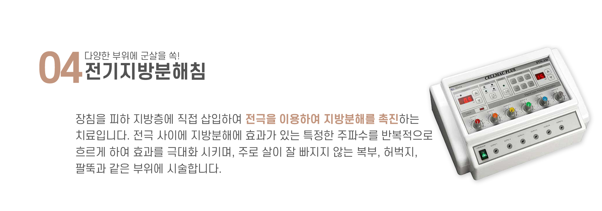장침을 피하 지방층에 직접 삽입하여 전극을 이용하여 지방분해를 촉진하는 치료입니다. 전극 사이에 지방분해에 효과가 있는 특정한 주파수를 반복적으로 흐르게 하여 효과를 극대화 시키며, 주로 살이 잘 빠지지 않는 복부, 허벅지, 팔뚝과 같은 부위에 시술합니다.