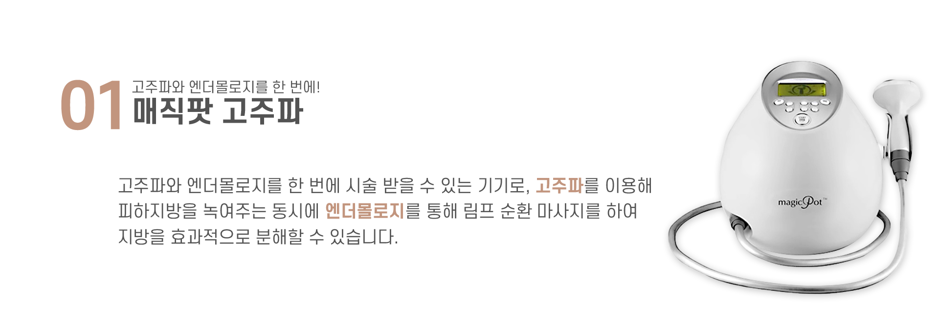 고주파와 엔더몰로지를 한 번에 시술 받을 수 있는 기기로, 고주파를 이용해 피하지방을 녹여주는 동시에 엔더몰로지를 통해 림프 순환 마사지를 이용하여 지방을 효과적으로 분해할 수 있습니다.