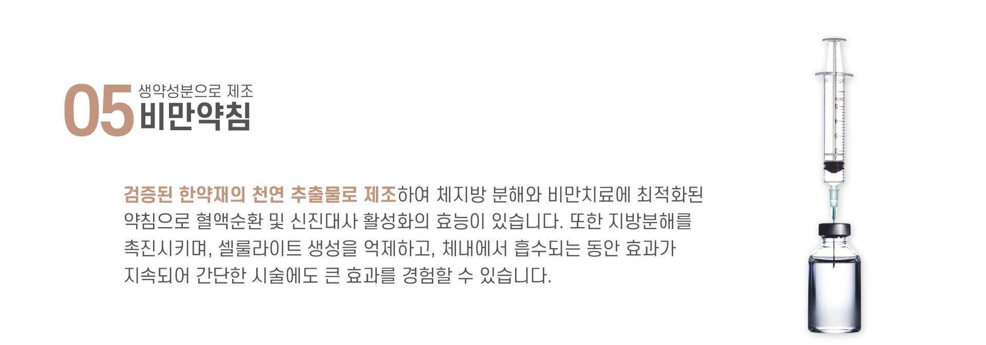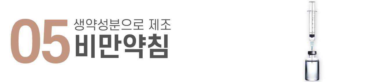 검증된 한약재의 천연 추출물로 제조하여 체지방 분해와 비만치료에 최적화된 약침으로 혈액순환 및 신진대사 활성화의 효능이 있습니다. 또한 지방분해를 촉진시키며, 셀룰라이트 생성을 억제하고, 체내에서 흡수되는 동안 효과가 지속되어 간단한 시술에도 큰 효과를 경험할 수 있습니다.