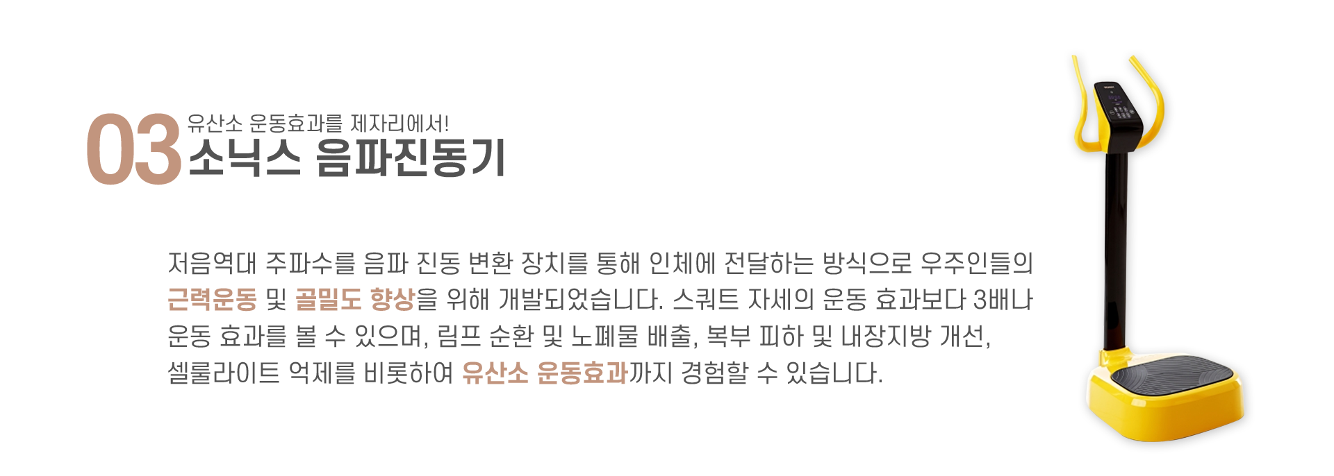 저음역대 주파수를 음파 진동 변환 장치를 통해 인체에 전달하는 방식으로 우주인들의 근력운동 및 골밀도 향상을 위해 개발되었습니다. 스쿼트 자세의 운동 효과보다 3배나 운동효과를 볼 수 있으며, 림프 순환 및 노폐물 배출, 복부 피하 및 내장지방 개선, 셀룰라이트 억제를 비롯하여 유산소 운동효과까지 경험할 수 있습니다.
